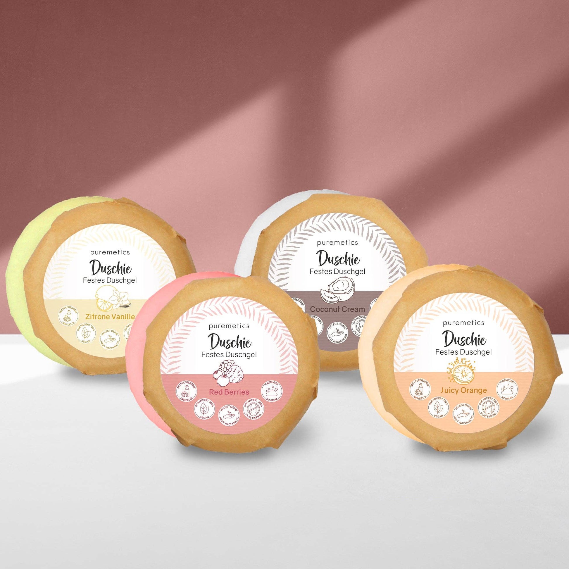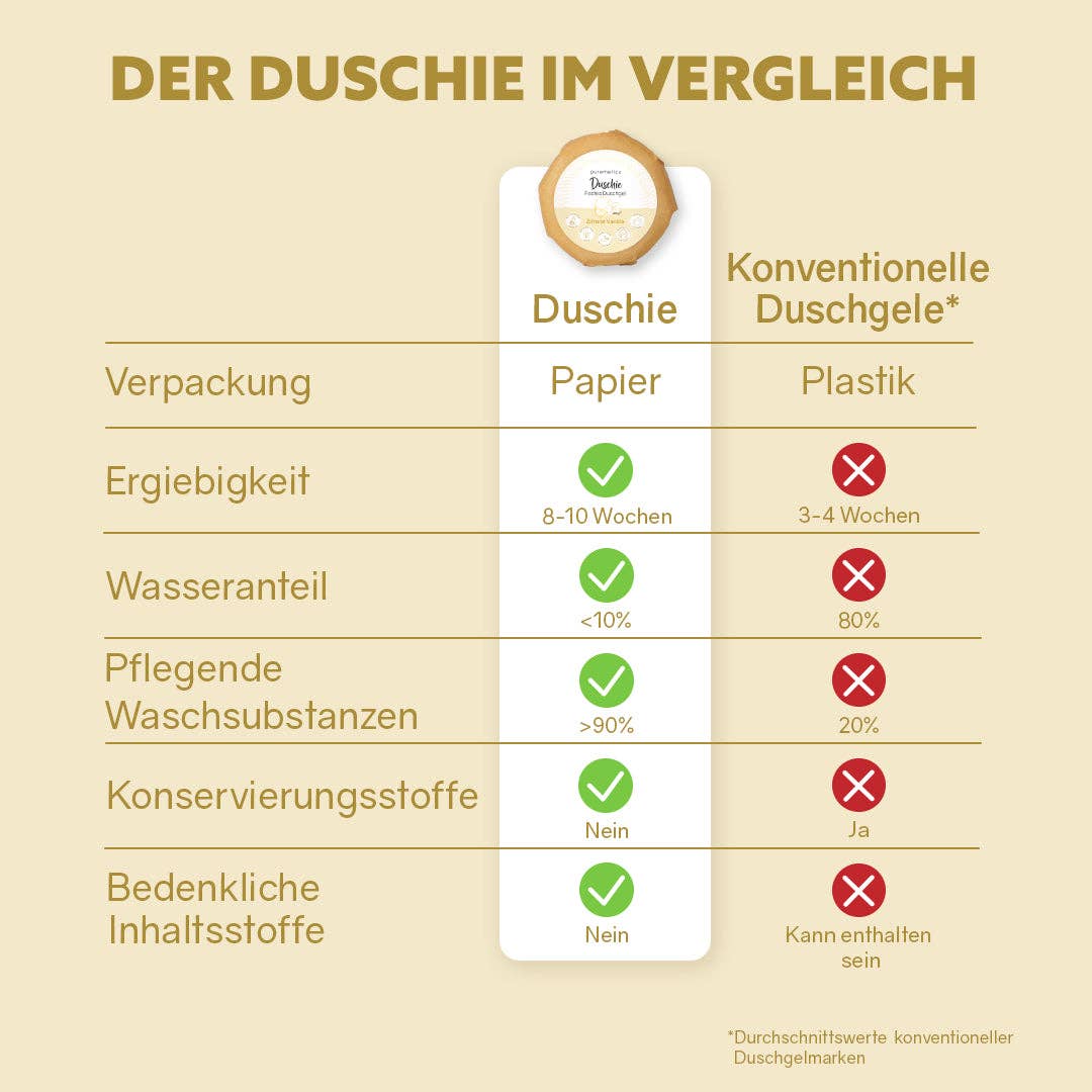 Jedes Duschie wird in einer kleinen Manufaktur in Hannover von Hand gefertigt – mit natürlichen Inhaltsstoffen, viel Sorgfalt und ganz ohne Kompromisse. Kleine Unregelmässigkeiten in Form und Farbe sind Teil des Charmes – jedes Stück ist ein echtes Unikat 💛