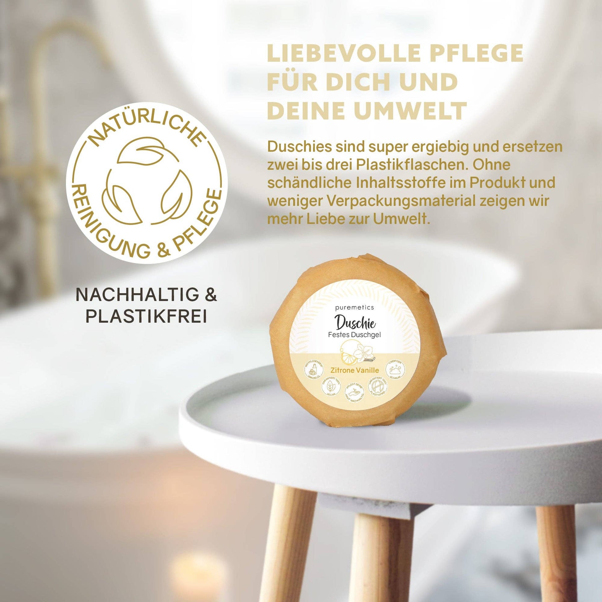 Der handgemachte Duschie „Zitrone Vanille“ von Puremetics ist ein festes Hydro-Duschgel, das Reinigung und Pflege perfekt vereint. Es schäumt cremig, duftet herrlich frisch und hinterlässt deine Haut weich, genährt und geschmeidig – ganz ohne Plastikverpackung.