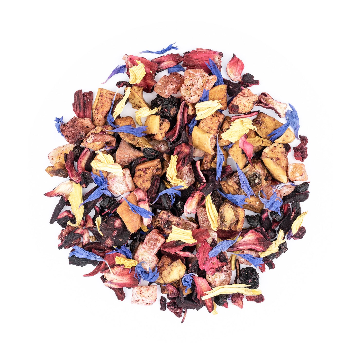 Hibiskusblüten, Apfelstücke, Papayawürfel (Papaya, Zucker), Korinthen, Fliederbeeren, schwarze Johannisbeeren, Aroma, gefriergetrocknete Himbeerstücke, gefriergetrocknete Erdbeerstücke, Sonnenblumenblüten, blaue Kornblumenblüten.