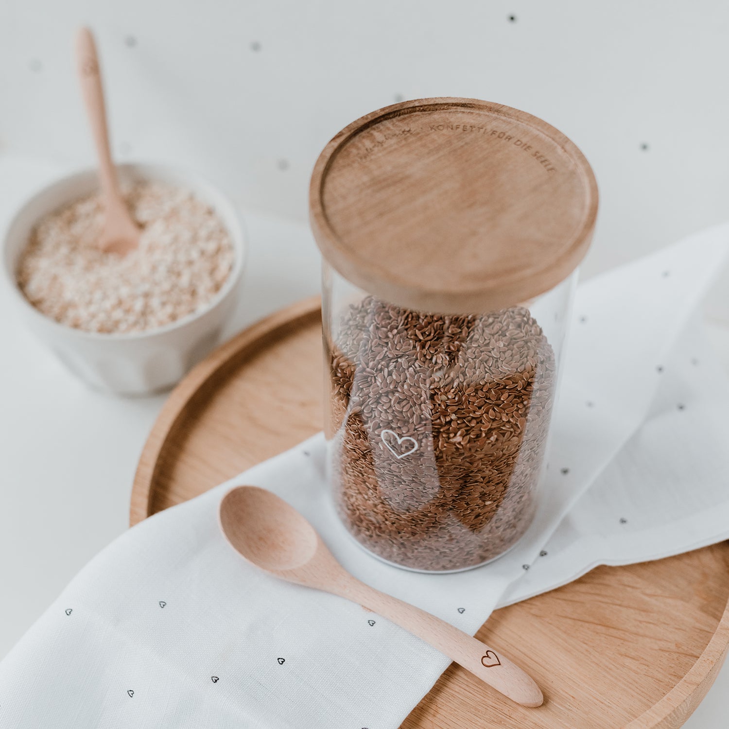 Gefertigt aus hochwertigem Borosilikatglas, ist das Vorratsglas besonders robust, langlebig und spülmaschinenfest. Der Deckel aus unbehandeltem Akazienholz trägt das Eulenschnitt-Logo sowie das liebevolle Motto „Konfetti für die Seele“. Durch die natürliche Maserung ist jeder Deckel ein Unikat. Ein integrierter Silikonring sorgt dafür, dass deine Vorräte luftdicht verschlossen und lange frisch bleiben.